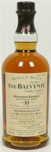 When looking around. and being new to Single Malts I almost fell in love by the shape of the bottle and really liked the way their labels looked. Not a lot to choose then. There was this 10yo (Founders Reserve), a 12yo (Double Wood), a 15yo (Single Cask), a 21yo (Port Wood) and a 25yo (Single Cask). And there was one limited oddity, the 17yo (Islay Cask). Nothing more. Today like with others there is more choice than ever. Lets have a look at the cheapest Balvenie, the 10yo “Founders Reserve”…